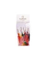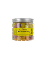 Sucre, Glucose, Eau, Arômes : citron, abricot, orange, fraise, framboise, mandarine, menthe, rose, violette, coquelicot, jasmin, Colorants : E100, E160c (paprika), E120 (extrait de cochenille), E162 (betterave), E141i (chlorophylle), E133 ; Gomme arabique, Acide Lactique E270.